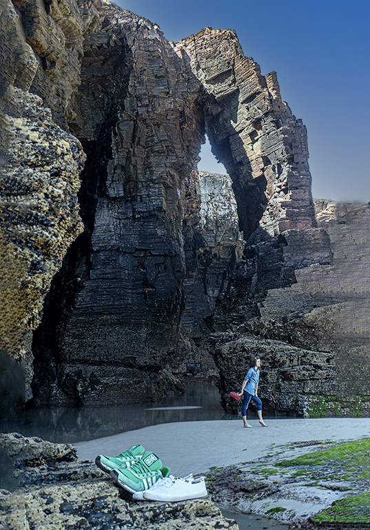 En la magnífica playa lucense de Las Catedrales (As Catedrais), se puede ver a mucha gente haciéndose fotos de las maneras más rocambolescas posibles. En esta ocasión, las zapatillas del primer plano hacen aún más simpática la pose de la chica del fondo. Mínima edición