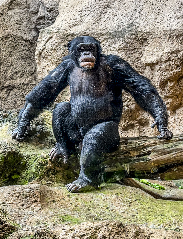 Este macho joven de chimpancé no dejaba de moverse de un lado para el otro, y con el cristal que lo separaba de los visitantes, no había manera de sacarle una toma decente. Hasta que pareció compadecerse de mis desvelos, se detuvo, y se colocó unos instantes en esa posición, como diciendo: "todo esto soy; píllame ya, que sigo con lo mío". Y lo pillé, claro. Luego, con un gesto con la mano le agradecí la deferencia. Pero él ya estaba en otros pensamientos. Mínima edición (reflejos aparte)
