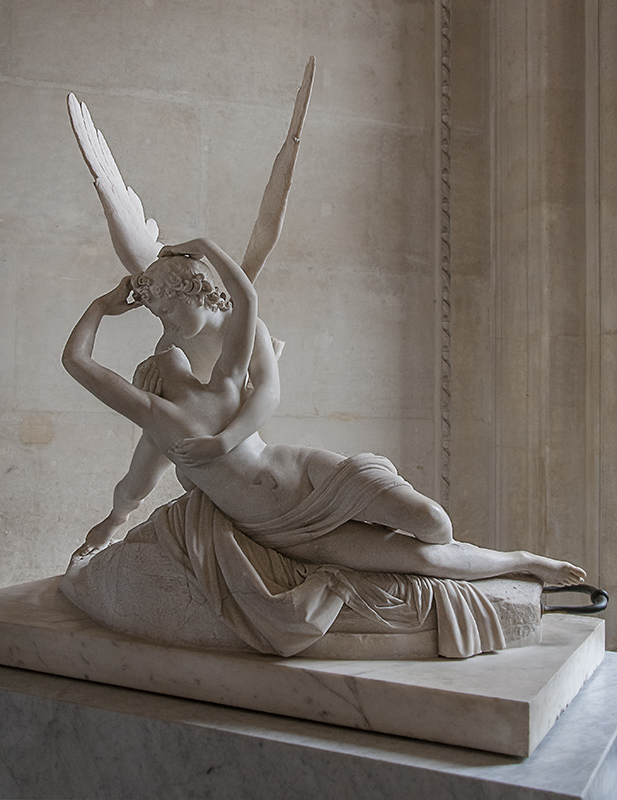 Esta obra maestra del escultor neoclásico Antonio Canova fue realizada en mármol en 1793. Según el propio escultor, esta obra representa el momento en que Eros, dios del Amor, acude a despertar a Psique (Personificación del Alma), del eterno sueño en el que había quedado sumida por las artes de Proserpina. La maestría de Canova en el tratamiento del mármol le permite representar el calor de los cuerpos, la vitalidad y el sentimiento, algo casi imposible de lograr con un material en apariencia frío y alejado de la naturaleza viva, consigue dotar de piel a sus esculturas. La composición, plena de diagonales y líneas onduladas, es otra de las maravillas de este conjunto. Mínima edición, aclarando algunas sombras