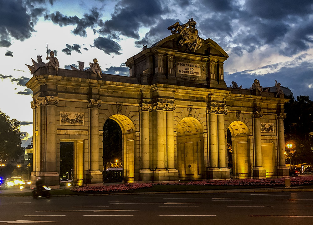 La conocidísima madrileña Puerta de Alcalá es un monumento neoclásico mandado construir por el rey Carlos III, en sustitución de una anterior que existía desde el XVI. Se terminó en 1778, y es obra del arquitecto italiano Francesco Sabatini. Su estructura imita la de los arcos de triunfo romanos, aunque al constar de cinco vanos (tres de medio punto, al mismo nivel; y los dos laterales, arquitrabados), la impresión es más rectangular y apaisada. Su ubicación en una gran rotonda al lado del Parque del Retiro, libre de edificios, permite contemplarla con nitidez (tráfico aparte). Se equilibraron algo las verticales convergentes, en la edición