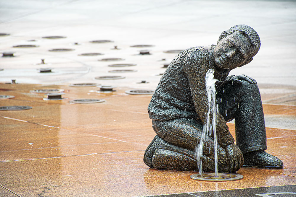 Esta figura es parte de un conjunto escultórico titulado "La fuente de los niños", que se halla en la plaza de Compostela. Elegí aislarla, porque para captar al grupo entero, muy interesante, debía interferir con muchos elementos urbanos indeseables y poco fotogénicos. Las figuras están esculpidas en granito y aluminio, obra de Manuel Collazo Torres. Mínima edición
