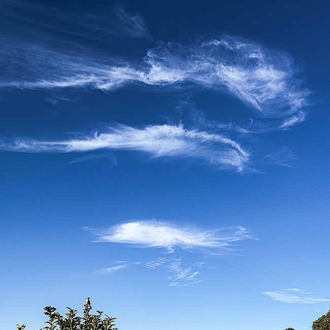 Composición que toma tres hilachas de nubes débiles, a las que parece contemplar con detenimiento una calandria, apostada en lo alto del arbusto inferior. Mínima edición