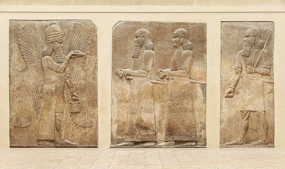 La colección de antigüedades del mayor museo del mundo es apabullante. Pero en mis visitas jamás falta un recorrido por la sala de Mesopotamia, sector Asiria, con sus toros androcéfalos, sus relieves de dioses, genios, héroes, reyes y guerreros. Estos tres bajorrelieves, que se exponen juntos (la foto no es fotomontaje) pertenecen al patio del Palacio de Khorsabad, mandado edificar por Sargón II a finales del s. VIII a. C. Se aprecia a un genio protector (a la izquierda) contrapuesto a tres guerreros. Edición de equilibrado de líneas y aumento de enfoque