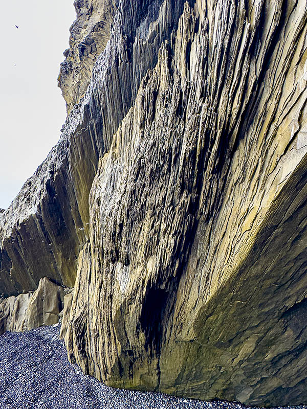 Las paredes de los acantilados de esta bellísima y terrible playa están repletas de señales de una erosión salvaje, que hace las delicias de cualquiera que se pare a mirar. Hay de todo tipo, aunque no son de las que estamos acostumbrados a ver aquí, pues dicha erosión (viento, lluvia y oleaje) actúa sobre rocas de origen volcánico, algo a lo que no estamos acostumbrados por acá. Mínima edición