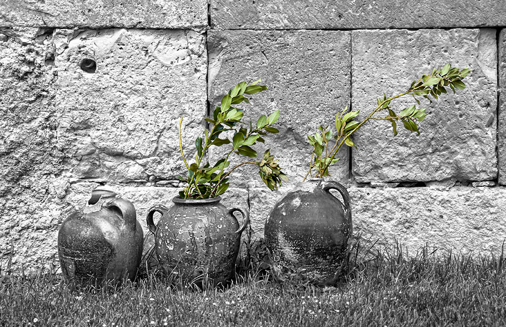 En el Castillo de Pedraza, que alberga también el museo del pintor Ignacio Zuloaga, encontré en uno de los patios, estas tinajas de cerámica al lado de un muro. Saqué la composición sin más, como conjunto de elementos que me gustó aunar en el encuadre. Sólo después , ya en la edición, me surgió la idea de desaturar todo excepto las ramas y las hojas (creo que eran de laurel) para potenciar el elemento vivo frente al inanimado.