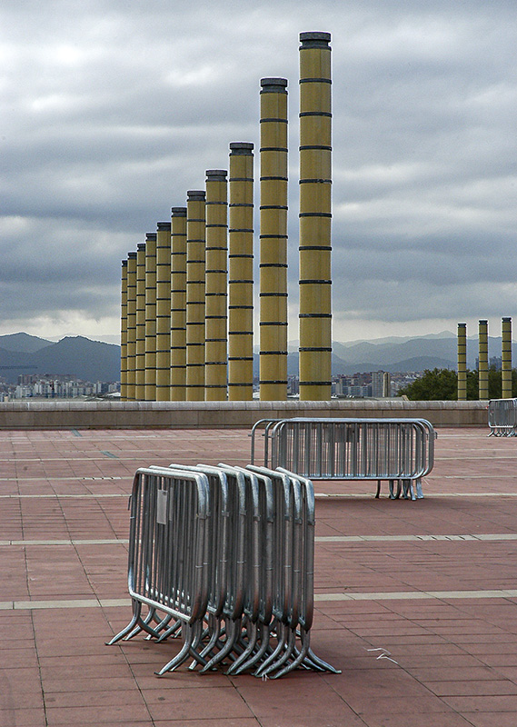 En el Anillo Olímpico de Montjuic hay muchas posibilidades de fotografiar ritmos, ya con lo que hay de forma fija y permanente. Si además, se añaden elementos que contribuyen a diversificar y heterogeneizar la composición, mejor todavía. En este caso, a los cilindros de la escultora Aiko Miyawaki, se le sumaron unas vallas azarosamente dispuestas. Mínima edición