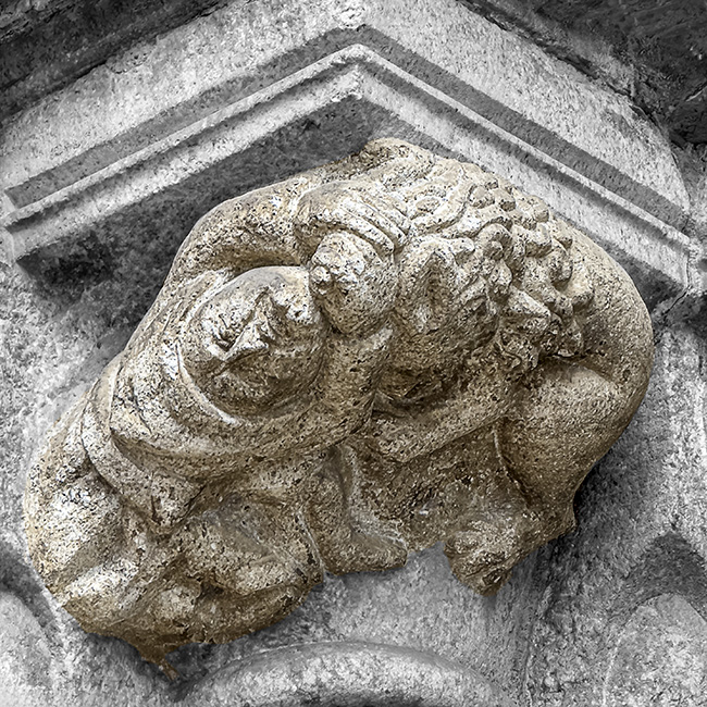Después de haber mirado la portada principal de la brigantina Iglesia de Santiago multitud de veces y de fotografiarla casi otras tantas, el otro día caigo en que uno de los capiteles de las columnillas de la parte izquierda muestra una representación bastante vívida del episodio en que el Juez Sansón se enfrenta a un león y lo destroza desencajando su mandíbula. La obra es del s. XIV, pero su estética es claramente románica, así como la disposición de todos los elementos del tímpano y las jambas. En la edición se desaturó lo que no fuera la escena principal