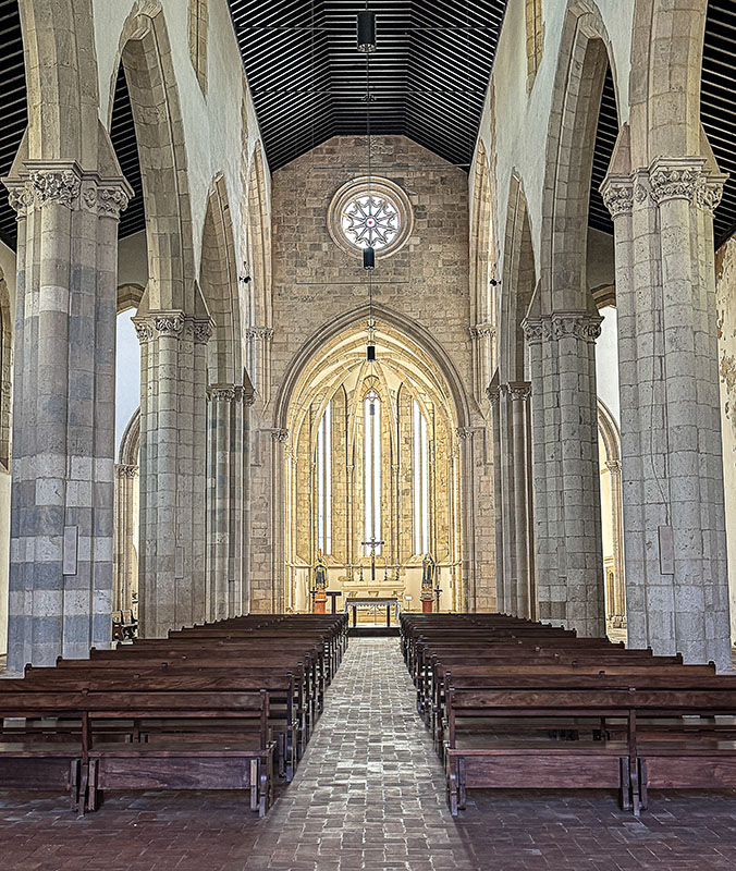 Interior de la iglesia de Sta. María da Graça, obra gótica iniciada en 1380. Este templo es considerado uno de los ejemplares más importantes del gótico portugués anterior al estilo manuelino, aun a pesar de no poseer cubrición de crucería, sino de artesonado de madera. En él se halla enterrado Pedro Álvares Cabral descubridor de Brasil. Mínima edición