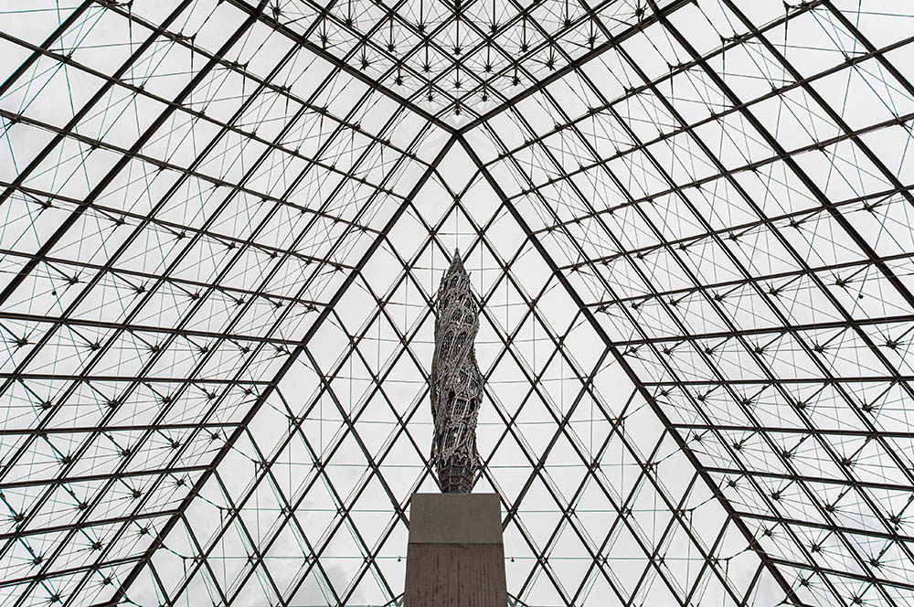 La pirámide acristalada del Louvre, obra diseñada por el chinoestadounidense Ieoh Ming Pei, se inauguró en 1988 -no sin una gran polémica- en el centro del Patio Napoleón del Museo del Louvre. Desde entonces es su entrada principal. Cuando se entra, la vista es espectacular desde casi cualquier punto de vista. La escultura que figura sobre el pilar central suele cambiar con el tiempo. Esta de 2012 es un homenaje al arte gótico, con varios ventanales ojivales retorciéndose en espiral. Mínima edición