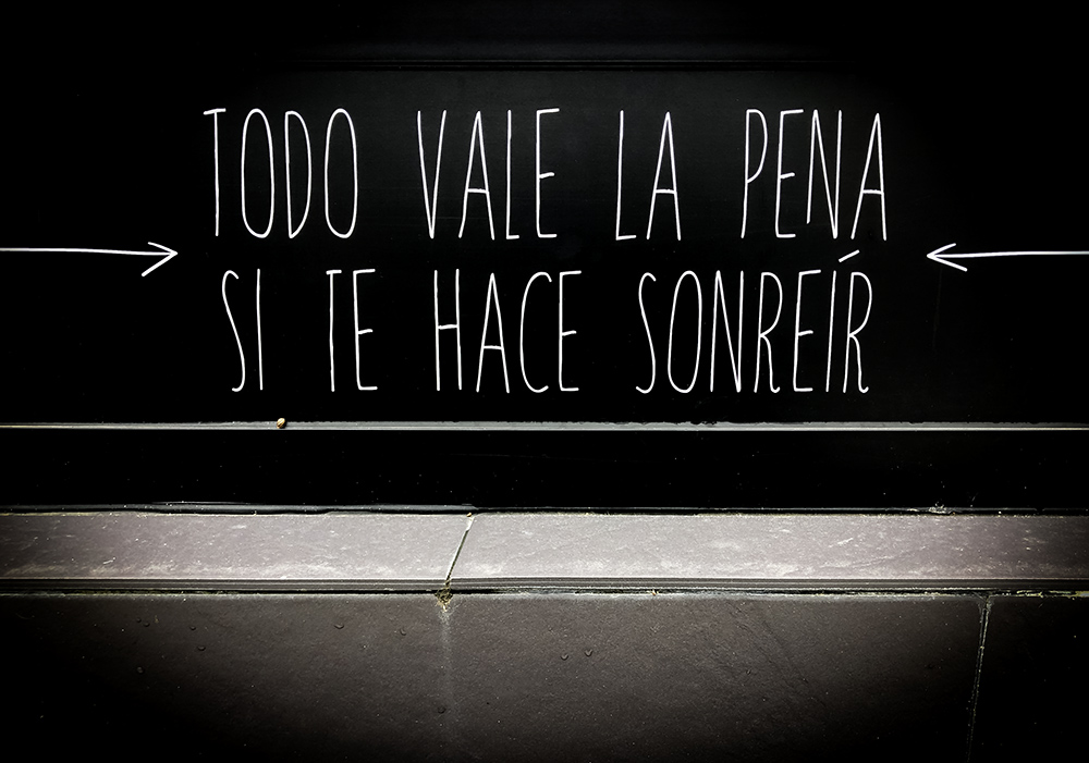 La frase está muy bien intencionada, y en la mayoría de las ocasiones es correcta. Pero situaciones habrá en la que la sonrisa, pese a brotar, no sea lo mejor, ni siquiera lo más conveniente. Con todo, si sonriéramos más, sería la señal de que viviríamos mejor o de que las posibilidades de lograrlo serían mucho mayores. En la edición, se le añadió la tilde que faltaba a la última palabra, y también se enmarcó con una máscara negra para evitar la falta de contraste del marco negro donde se ubicaba la pintada