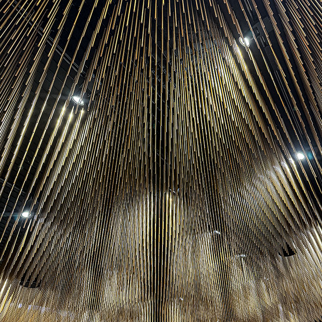 El salón de convites de uno de los más destacados centros de celebración de eventos de la zona coruñesa, tiene un techo espectacular con cientos de varillas doradas que penden haciendo ondas y diversos dibujos rítmicos abstractos, muy llamativos. Mínima edición