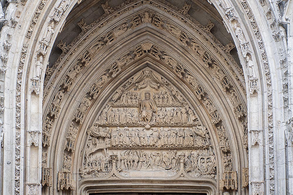 El maravilloso pórtico flamígero de esta iglesia consta de cinco vanos que dan paso a las portadas reales, con sus correspondientes tímpanos, de los cuales aquí se muestra el principal, el del centro. Joya del gótico final, realizada entre finales del s. XV y principios del XVI, su apariencia es de una filigrana en piedra. El motivo que se exhibe en el tímpano, ordenado en franjas horizontales que se leen de abajo a arriba, es el Juicio Final