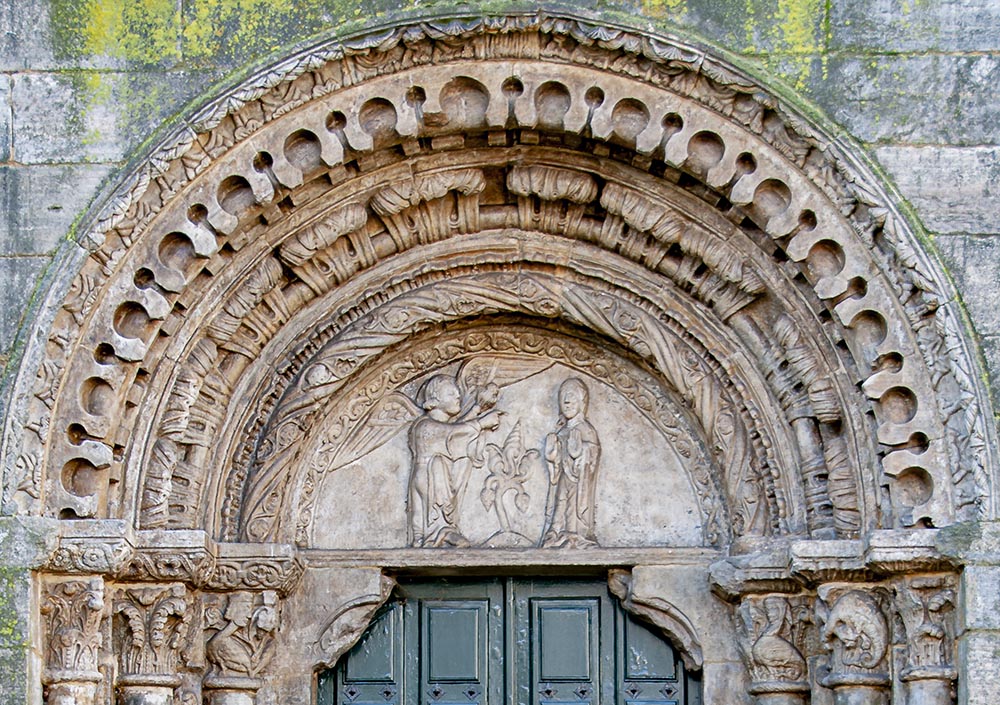 Parte superior de la portada norte de la iglesia de S. Juan (o S. Nicolás) de Portomarín, obra románica de finales del XII y principios del XIII. Contrasta el detalle y la variedad decorativa de las arquivoltas con la gran sencillez del tímpano. Ésste nos muestra el tema de la Anunciación únicamente con tres figuras, el ángel, María y un pequeño arbolito de tres hojas y dos frutos que, a decir de J. Cobreros evoca al tiempo la Trinidad y la doble naturaleza del Cristo que se encarnará a raíz de este encuentro. En la edición se añadió saturación y se equilibraron las líneas paralelas
