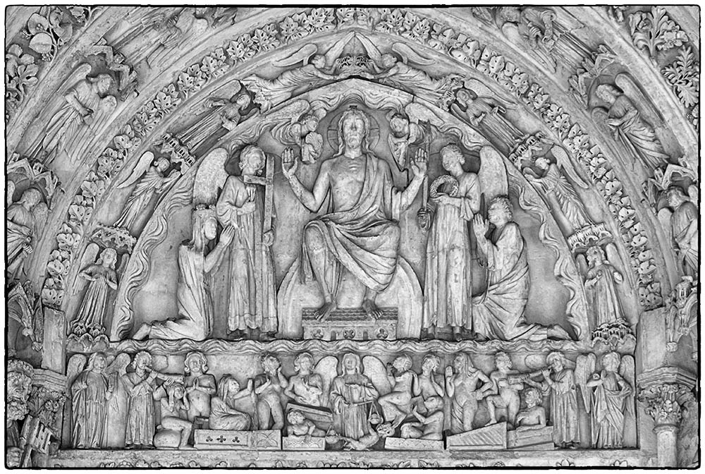 Edificio menos conocido que otros más habituales de entre el tremendo patrimonio arquitectónico bordelés, la Basílica de Saint Saurin alberga alguna que otra maravilla, como su portada sur, trilobulada, cuyo tímpano central se muestra aquí. Obra gótica del s. XIII, muestra la típico escena del Juicio Final aún con gran jerarquía coompositiva, con el Pantocrátor muy grande; ángeles portadores de los símbolos de la Pasión, algo menores, al igual que la déesis con la Virgen María y San Juan a ambos lados, de menor tamaño. En la parte inferior, la resurrección de los muertos. Edité la imagen al B/N porque el color de la piedra no me agradaba