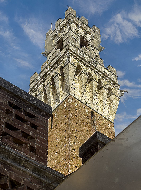 La altura de las torres que coronaban los consistorios (y también los palacios de los burgueses pudientes) en la Toscana medieval era una manera de demostrar poderío y estatus, tanto económico como militar. El de Siena, con sus 88 m. fue concebido precisamente para ser más alto y esbelto que el de la vecina -y enemiga- Florencia. También llamada Torre del Mangia, consta de un cuerpo inferior alargado de ladrillo, y el campanario, reforzado como si de una estructura militar se tratase, es de mármol travertino. Fue construida principalmente en el s. XIV. Mínima edición