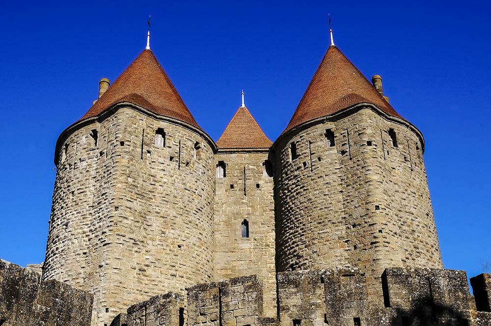 La fortaleza medieval de Carcassonne tiene varios puntos de acceso, todos ellos sólidos y de buena defensa, pues no en vano su utilidad era precisamente ésa. De entre las varias puertas, destaca por su altura ésta, en la fachada sur, con dos torreones y puente sobre foso. Todo el conjunto está restaurado, pero llama la atención en este caso que las cubriciones -cónicas o piramidales- lleven la teja de arcilla romana que llevaba en origen, y no la pizarra que impuso casi monográficamente (aquí y en otros monumentos) el restaurador Viollet-le-Duc, de ideas medievales algo estrechas y poco dialogadas. Mínima edición