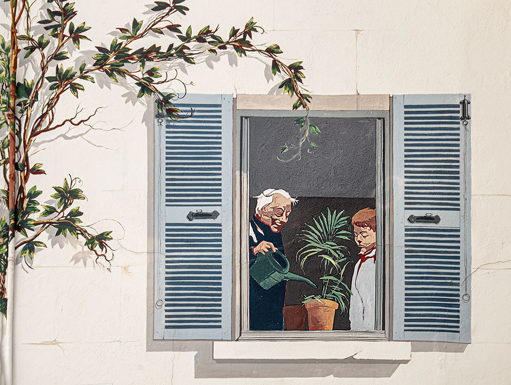Angulema es una de las mecas mundiales del cómic, cuyo Festival Internacional de la Historieta es uno de los mejores y más reputados certámenes del género. Por toda la ciudad abundan las señales de esta afición, y son muchas las fachadas y edificios que cuentan con pintadas, trampantojos y homenajes a los grandes autores del cómic. Éste es uno de ellos, donde un abuelo riega una planta en presencia de su nieto, dando un buen ejemplo de cómo, cuándo y por qué. Mínima edición