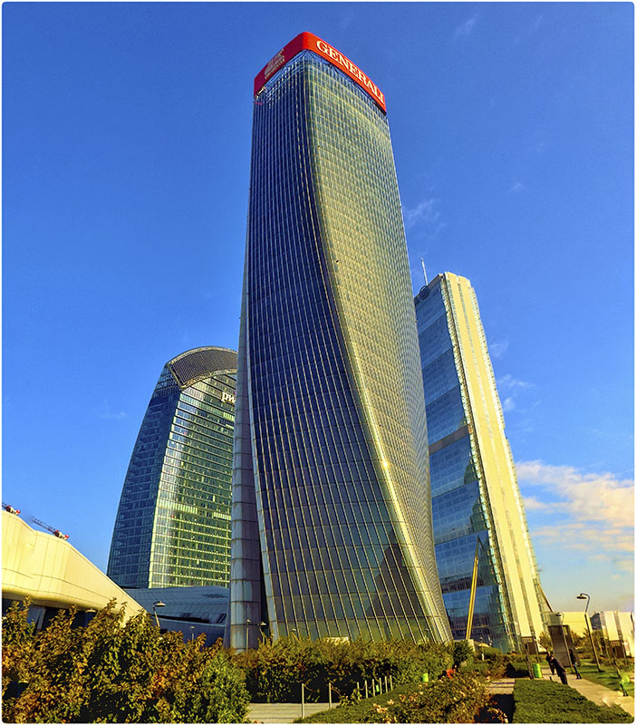 Aunque la espectacular Torre Generali (en el centro, con 194 m., de Zaha Hadid) parezca más alta por la posición, es el más frío y ortogonal edificio Allianz (el de la derecha, con 209 m., de Arata Isozaki; 262, con la antena) el más alto de los tres. El tercero en discordia, la Torre PWC, de perfil claramente curvo en sí, y diseñado por Daniel Libenskind, "sólo" alcanza los 175 m. Los tres se ubican en terrenos de la antigua Feria de Milán, que ahora se denomina CityLife. En la edición se saturaron más los colores