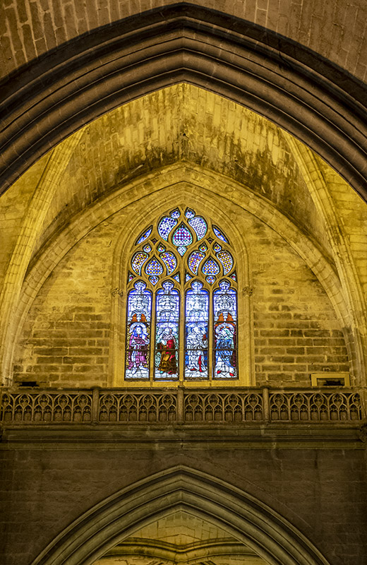 Ventanal con tracería y su vidriera, en una de las naves de la Catedral de Sevilla, de mediados del s. XV, en estilo gótico florido. Además, se observan arcos ojivales y bóveda de crucería