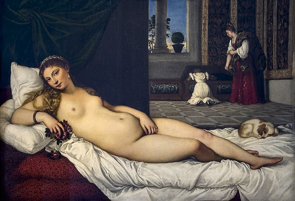 Una de las pinturas más sensuales y eróticas que se muestran en la Galería de los Uffizzi, si no la que más. Obra de madurez del genial Tiziano, toma como base la Venus Dormida de Giorgione, pero la dota de un erotismo mucho mayor a través del contraste entre los tonos cálidos, suaves y cercanos de la piel desnuda de la mujer y los fríos y alejados del fondo, pero sobre todo por la conexión que establece su mirada entre inocente y lasciva, con el espectador, a quien mira sin complejos, incluso incitándolo a decantarse por una actitud u otra. A lo que ha de sumarse su mano izquierda, siguiendo modelos de las Venus Púdicas, pero que aquí resalta más que oculta. Mínima edición