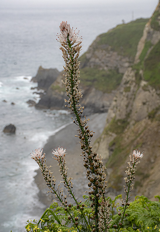 A pesar del viento casi constante, de unas condiciones climáticas variables y a menudo adversas, y de una cobertera vegetal mínima, hay plantas que son capaces de medrar en entornos difíciles. Aquí un buen ejemplo, que dota de un bello marco al desenfocado Cabo Busto, una de las más bellas cumbres latitudinales asturianas. Mínima edición