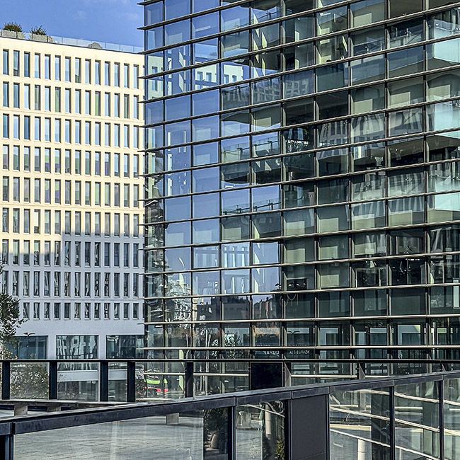 En la zona de rascacielos donde se ubica el Proyecto Porta Nuova, lo que prima es este tipo de materiales ligeros y versátiles. No dudamos de la subestructura de hormigón, pero por fuera lo cierto es que brilla por su ausencia. Mínima edición