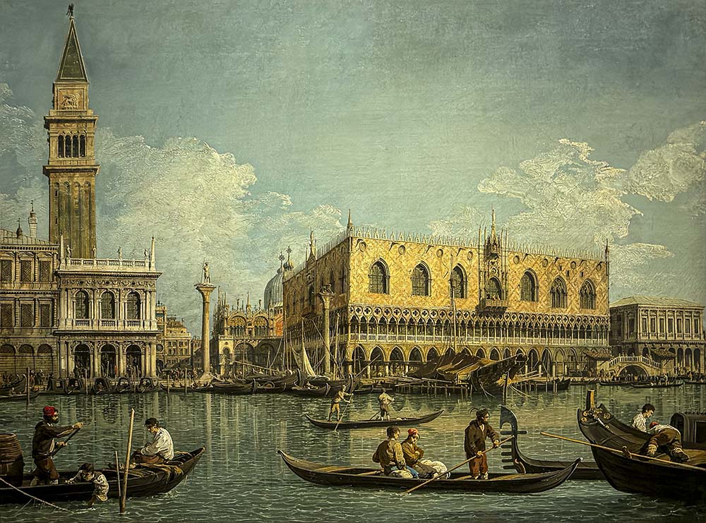 Otra de las joyas de la pinacoteca de Brera. Este pintor veneciano se hizo famoso, de nombre Giovanni Antonio Canal, pero conocido como "Il Canaletto", se especializó en lo que se llamó "veduttismo", un tipo de paisajes urbanísticos venecianos muy realistas, con gran uso de la perspectiva, envueltos en una luz dorada, llena de matices, propios de la época final del barroco, lindando con el rococó. En la edición se eliminó el marco y se sustituyeron puntitos blancos de reflejo de la iluminación en la pintura