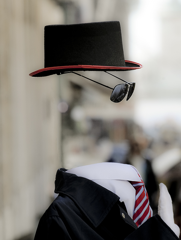 Ahí lo tienen. Agazapado. Oculto. Tal vez pensando en su hipoteca, acaso añorando un poco más de abrigo, o puede que sudando y deseando tomarse un buen trago fresco. Pero de momento, ahí se encuentra, en mitad de la calle, bien flanqueado de transeúntes sorprendidos que, una vez identificado el truco, se sonríen y arrojan algunas monedas, a veces con foto mediante, o bien pasan de largo.