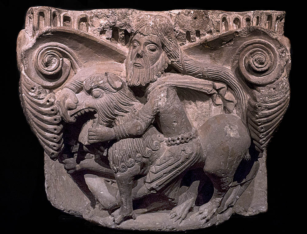 Tómese como ejemplo este capitel. En él sólo dos figuras. Un hombre, y una bestia que aquél toma por la boca con la intención -imaginamos- de abrírsela por completo y evitar su mordisco fatal. Sólo dos figuras. A cambio, contemplemos el detalle de las mismas, sus atributos, y el marco arquitectónico que las encuadra. (Éste, si se fija uno, no deja de ser un capitel compuesto, cuyas volutas se pueden observar de forma simétrica, así como dos hojas de acanto esquematizadas, como restos de un orden considerado pagano, pero referencia de todo lo que le sucedió). Fijémonos después en los rizos de la barba de este hombre, en los de la melena del león. Delicadísimos, ¿verdad? Pero, ¿ya sabemos que es un león? Quien lo esculpió no debió haber visto muchos, es cierto; o ninguno. Sabía que era un felino con melena en el cuello, y que era grande y fuerte. Lo sabía por las Escrituras y otros libros que los describían. Sus garras no dejan de llamarnos la atención, así como sus dientes, bien notorios. De modo que muestra tamaño, melena, garras, dientes. Queda bien claro que es un animal poderoso. Pero ¿y el hombre? Sus músculos no parecen gran cosa. Su altura, tampoco. No parece muy fuerte. Pero ¿y su melena? Centremos la mirada en su cabello. Lo muestra muy largo, recogido con cintas para evitar que su volumen se desparrame, y en movimiento (a lo que también contribuye la capa). Ésa será la seña de identidad de este personaje, su pelo, que es la conexión con su dios. Y ahora ya sabemos que ese personaje es Sansón, que está desquijarando al león (trasunto del Hércules greco-latino, y su león de Nemea), prueba absoluta de una fuerza cuyo origen es divino. Pero eso ya lo sabía cualquiera que en la Edad Media contemplara dicho capitel. Sabía que la fuerza necesaria para derrotar a un león le viene de que es un hombre de fe, conectado a Dios con su pelo. No necesitaba más claves. Daba lo mismo que la escena no hubiera sucedido con dichos ropajes o que el animal no fuera muy verosímil. El mensaje ya estaba emitido y, adecuadamente descodificado, había sido recibido. Y ésa es la magia del románico: que pese a que el mensaje es la prioridad, aún le queda tiempo al artista para conmovernos con la disposición de sus elementos, si le dedicamos un poco de tiempo, y si sabemos -y queremos- mirar.