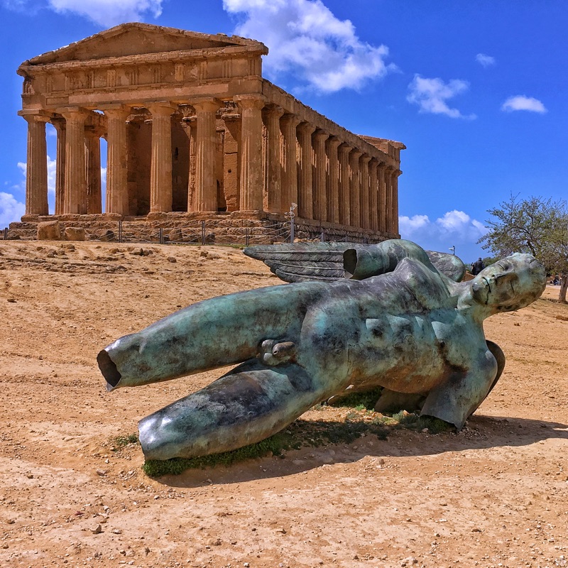 Por último, cuando ya el templo deja de impactar lo suficiente como para restaurar el aliento, agitado pero exultante, se repara en que a los pies del templo hay una figura contemporánea, que sin embargo conecta maravillosamente con aquel mundo antiguo que tanto nos subyuga todavía. Uno de los símbolos de aquella Hélade cuyas historias todavía hoy nos enseñan a vivir, Ícaro caído, reconvertido por Igor Mitoraj en escultura monumental (mide alrededor de 5 metros) nos ayuda a intensificar la sensación de que, en efecto, nos hallamos en la Grecia antigua, rodeados de religión que luego devino mitología, pero que aún hoy repasamos, agradecidos, para que nada de lo hallado por aquella civilización bendecida por los dioses se pierda irremisiblemente.