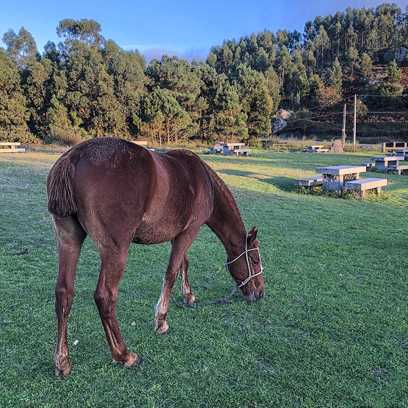 La yegua no nos tenía miedo ninguno. Se la notaba acostumbrada a la presencia de humanos. Con todo, no dejaba de mirarnos de reojo, a cada poco. Puro instinto, supongo. Como estaba muy limpia y parecía sana, nos acercamos, a ver si éramos capaces de acariciarla. Y, sí, nos permitió acercarnos, y cuando le dimos la mano para que la oliera o nos lamiera, nos olió, pero no le debimos gustar. Además, no sudábamos, con lo que no debíamos tener mucha sal en las manos. De modo que las tres o cuatro veces que acercó sus ollares a las manos que le ofrecimos, nos miró luego un poco de soslayo, y volvió siempre a su rutinaria pero urgente tarea de comer toda la hierba fresca posible. Al fin y al cabo, faltaba sólo una hora para que el sol se pusiese. Insistimos algo más, buscando en esencia alguna imagen interesante que captar, pero ya no nos hizo más caso. La yegua se fue alejando al ritmo lento que la desaparición de su comida le fue marcando. La hierba quedó bien segada. Nosotros, algo mohínos. Y ella, tan tranquila, merendando en el merendero.