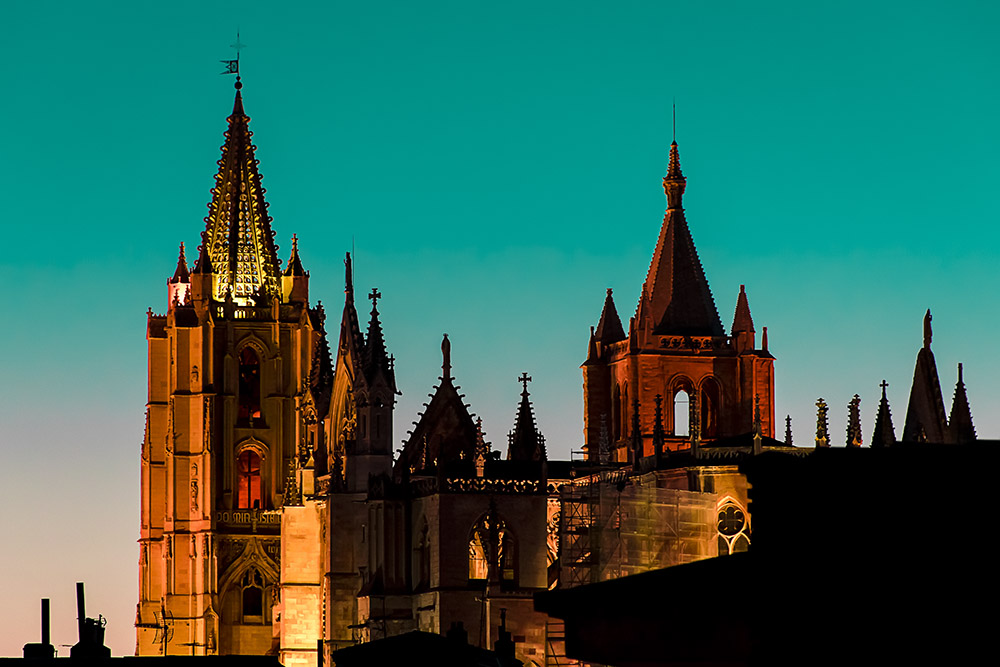 Mis padres son unos privilegiados en algunos aspectos. Uno de ellos es que viven en un piso desde donde se puede ver el monumento más célebre de la ciudad, la pulchra leonina, es decir, la catedral de León. Desde su terraza se puede contemplar la vista que se puede observar en la imagen. A pesar de algunos edificios más bajos, se distinguen con claridad las torres (sobre todo, la meridional, más moderna), los tres vacíos hastiales y parte de la cabecera. En cualquier caso, lo suficiente como para contemplarla con deleite a lo largo de muchos momentos de luz distinta a lo largo del día.