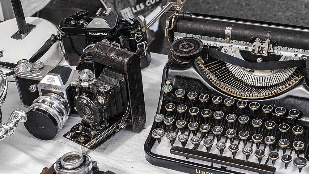 Pues bien, cuando en una feria de antigüedades, mercadillo, mercado de saldos o similar, veo los instrumentos con los que trabajo, sobre todo si son antiguos, me esponjo, me enternezco y dejo volar mi imaginación. Admiro la belleza de sus diseños, finjo un ataque de melancolía retrospectiva y si hay alguien a mi alrededor, miento un poco y digo “quién pillara aquellos tiempos”. Luego, claro, comparo esos deliciosos objetos con los mucho más feos y frágiles con los que ahora realizo tales tareas y me digo que no los cambiaría por los antiguos, ni harto de chicha colombiana. Mi ordenador y mis digitales, por encima de todo. Ahora, eso sí, a la hora de sacarles una foto de interés, lo antiguo ofrece mejor perfil y más acusada fotogenia. Lo nuevo suele ser efímero y mostrar tendencia hacia lo feo. Como bien se puede apreciar en las protagonistas de la imagen superior, que estarán viejas y probablemente ya no funcionen, dada su cronología, pero con toda seguridad son mucho más bonitas que las cámaras que hoy utilizo y el impresionante armatoste con que tecleo estas líneas.