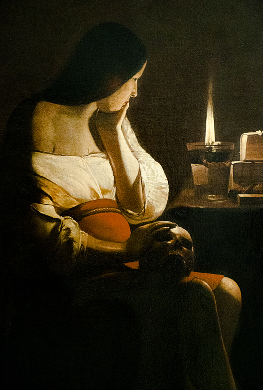 ¿Qué piensa María Magdalena en esa postura? ¿A quién añora exactamente? ¿Qué espera de su vida, desaparecida ya la figura de su principal valedor? ¿Qué le sugiere la mecha del candil de aceite suspendida en el vaso? Su mano sobre la calavera, ¿le recuerda su segura muerte? ¿Tal vez rememore la Pasión y todo el calvario de su amado Jesús? ¿Acaso la luz sin más, o tal vez la Luz, aquella que el Maestro predicara? ¿Y es tristeza o melancolía lo que a sus ojos se asoma? ¿Es por ventura serenidad ante lo inevitable, o zozobra por el más inmediato porvenir? Son muchos los interrogantes que esa figura que nos hurta la mayor parte de su rostro. Muchas, también, las posibilidades que los pinceles de Georges La Tour nos brindan esos claroscuros naturalistas y extremos. Mucho, lo que debemos pararnos a pensar y admirar cuando, de nuevo, lo contemplemos arrobados en la pinacoteca del mayor museo del mundo.