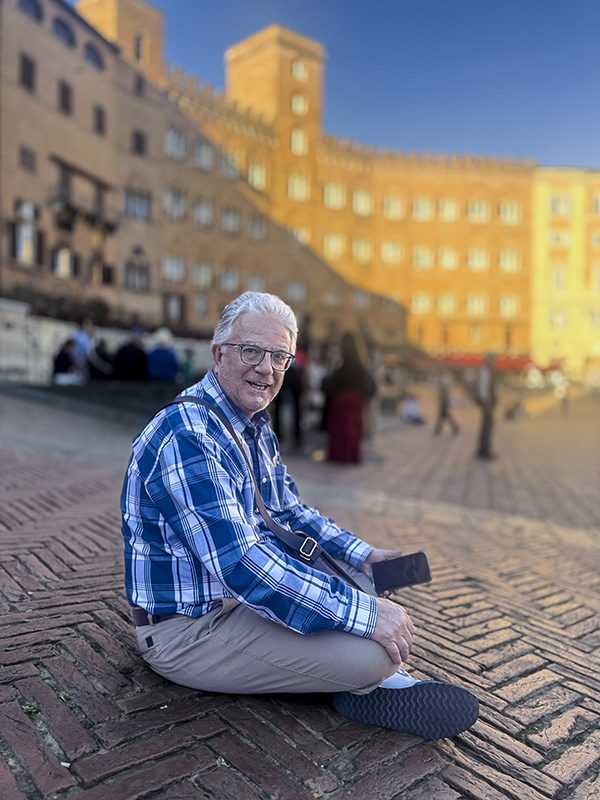 Treinta y cuatro años después (que ya me valió la tontería, máxime siendo profesor de Historia y de Arte), regresé a Siena, como parte de un extraordinario viaje a la Toscana, realizado en autocaravana y no en autobús, como entonces. Y jubilado, a mayores. Y con mi pareja. Circunstancias todas ellas, muy distintas. Pero Siena sigue siendo Siena. Y cuando, tras los rodeos dilatorios correspondientes, entramos en la Piazza del Campo, me emocioné. Y lloré, incluso. Y me senté en el mismo lugar donde entonces me había dedicado a prospectar con mi zoom a la gente que pululaba por allí. Y ahí es donde pedí la foto que ilustra este texto, que está en color, fue realizada con un móvil y por alguien que no tenía vinculación alguna con aquel momento. Pero la foto me encantó.