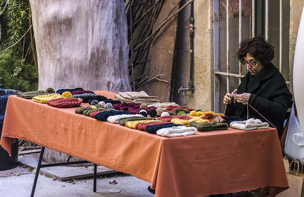 Sí, sí, tejo. Lo que hago es tejer. Siempre tejí. Desde pequeñita, cuando mi abuela me enseñó. Sí, mi abuela. Mi madre no podía, pobrecita; éramos siete, ¿qué tiempo iba a tener ella? Pero siempre me gustó. Aquellas manos largas y huesudas eran mucho más hábiles que las mías, regordetas y chiquitas. Pero nos entendíamos bien. Y cuando había algún problema en casa, teníamos ella y yo nuestro refugio, y tejíamos juntas en la galería, viendo llover o tras las cortinas cuando hacía sol. Ella me indicaba lo que hacía mal. Pero suavemente, sin gritar, como hacía mi tío. A veces charlábamos un poco. No era de mucho hablar. Yo sí. Le tiraba de la lengua. Me enteré de muchas cosas de la familia… Pero eso es otra cuestión, señor periodista. Todas las familias tienen lo suyo. Pero el caso es que sí, toda la vida tejiendo. Primero, por juego, por puro entretenimiento. Luego, porque un jersey y una bufanda venían bien siempre en casa. Más adelante, para mi marido y mis hijos. No es que no hiciera otras cosas, ya se imaginará. Pero era con lo que más disfrutaba, cuando me quedaba un tiempo libre. No era mucho, pero siempre sacaba algún ratito por la noche, o en el parque con los críos. No era gran cosa, pero con el tiempo adquirí una práctica que otros llaman habilidad. No sé yo. Repitiendo algo muchas veces, acaba saliendo, ¿no? Si esto es muy mecánico. Yo, lo que es inventiva y creatividad… Vamos, que yo de artista tengo bien poco. Combino bien los colores, eso sí; no como mi santo, que en gloria esté. Pero más allá de eso… Y, bueno, cuando una se queda sola, pues algo hay que hacer. Y yo nunca trabajé fuera de casa. Imagínese. Fue una vecina, que venía a este mercado a menudo. Me sugirió que ya que tejía en casa, para mí o para vecinos y amigas, que lo hiciera para los demás, y cobrando por ello. Que con eso, y la pensión podría ir tirando. Y, sí, lo hice. Con mucho miedo, claro, porque una… Pero estos chicos son estupendos. Me arreglaron los papeles, me ayudaron a contactar con dos mayoristas. Y aquí estoy. No vendo como para hacerme rica, pero todos los fines de semana salen algunos billetes. Suficientes para darme cuenta de que lo que hago le sirve a alguien. Y que además, me sigue gustando. Porque si no me gustara, sería un infierno, todo siempre igual. Pero a mí esto me relaja. Mientras tejo, veo la tele, escucho la radio, pienso, lloro un poco, recuerdo a mis hijos, tan lejos… Por eso me ves aquí cada fin de semana. Siempre tejiendo. Tienes cara de frío. ¿No querrías una bufanda?