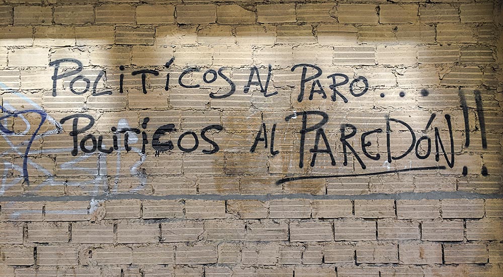 Paro y paredón no tienen semánticamente mucho que ver (como no sea que con el procedimiento drástico del paredón se podría reducir el paro; pero parece algo extremista y de dificil consenso aun entre políticos neoliberales). Sin embargo, por arte del grafitero en cuestión ambos vocablos nos remiten de golpe a un deseo popular de determinados sectores que convergen en dos castigos tremendos que parte de los ciudadanos desearía aplicar a los políticos en general, y a algunos -seguramente- en particular. Viene a decir que los políticos se merecen quedarse sin empleo (y así experimentar lo que tantos en los últimos tiempos), y también que, ya puestos, todos se han hecho acreedores de un fusilamiento en serie.