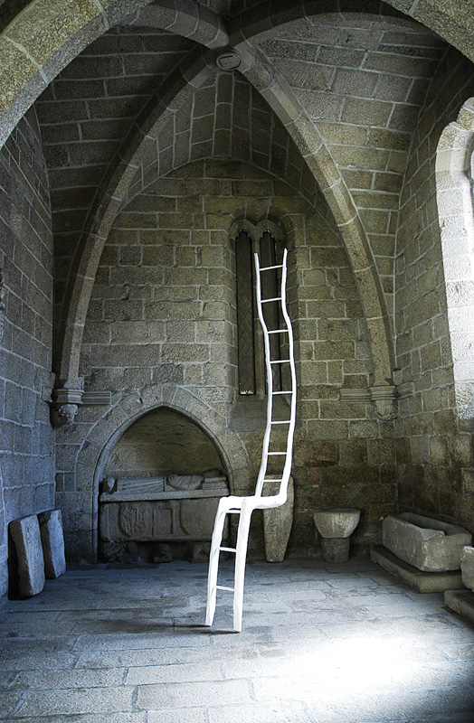 Al llegar a la capilla, algo se tornó inestable en mi interior. Un torbellino de sensaciones fueron surgiendo a medida que mis ojos recorrían el pequeño recinto. La mirada fue dirigida por los nervios de la crucería hacia la clave de bóveda, de una sencillez sobrecogedora. Mi fe siempre fue indudable, pero ahora sentía que me elevaba, que me transportaba a las alturas celestiales. Deseaba reunirme con Dios, ansiaba su compañía… cuando una escalera brillantísima apareció en el centro e iluminó la estancia con su radiante pureza. ¡Me ha oído! ¡Es la señal! Eso pensé. Y, sí, en efecto lo era. Pero la escalera no era divina, sino humana; no era de luz, sino de madera; no conducía al cielo, sino hasta un poco más abajo del techo; y no era recta, sino quebrada y decreciente. Temblé, dudé, y en la duda se resolvió todo. La costalada fue de impresión, y para castigar mi tibieza, mis vértebras sufrieron una revelación: la gran cantidad de fisuras que las recorren desde entonces. Quedé muy resentido, en el cuerpo, en mi alma y en mi fe. Sobre todo en mi fe, claro, porque después de ir a Lourdes, a Fátima y a Torreciudad, aún continúo en silla de ruedas.